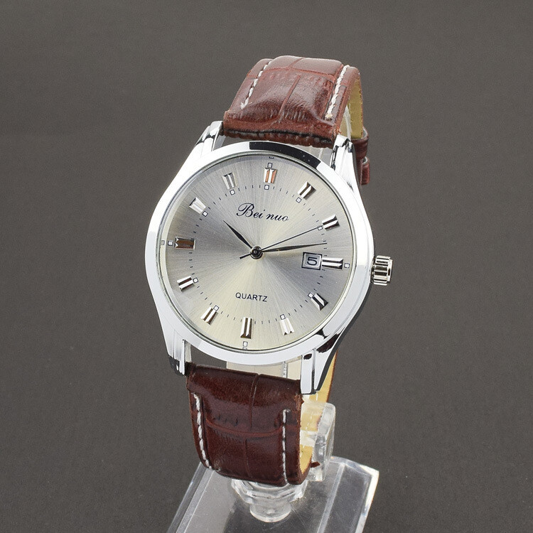 Men Fashion Brown Leather Band Stainless Steel Calendar Dial Quartz
