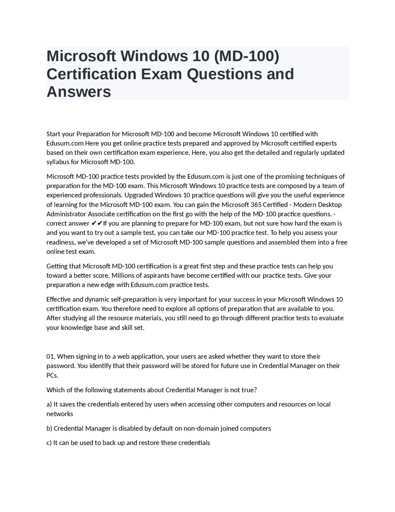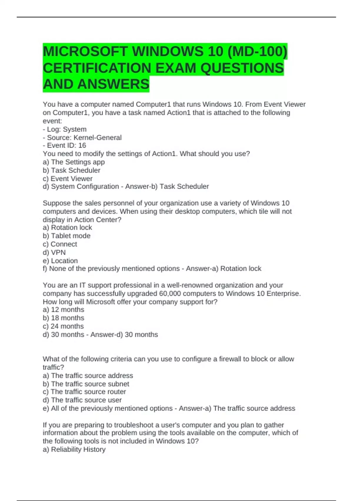 Microsoft Windows 10 (MD 100) Certification Exam Questions and Answers