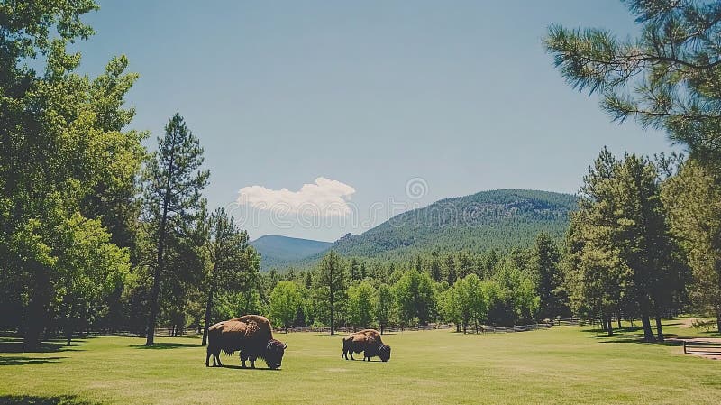 Bison Grazing Park Meadow Mountain Backdrop Summer Stock Photos Free