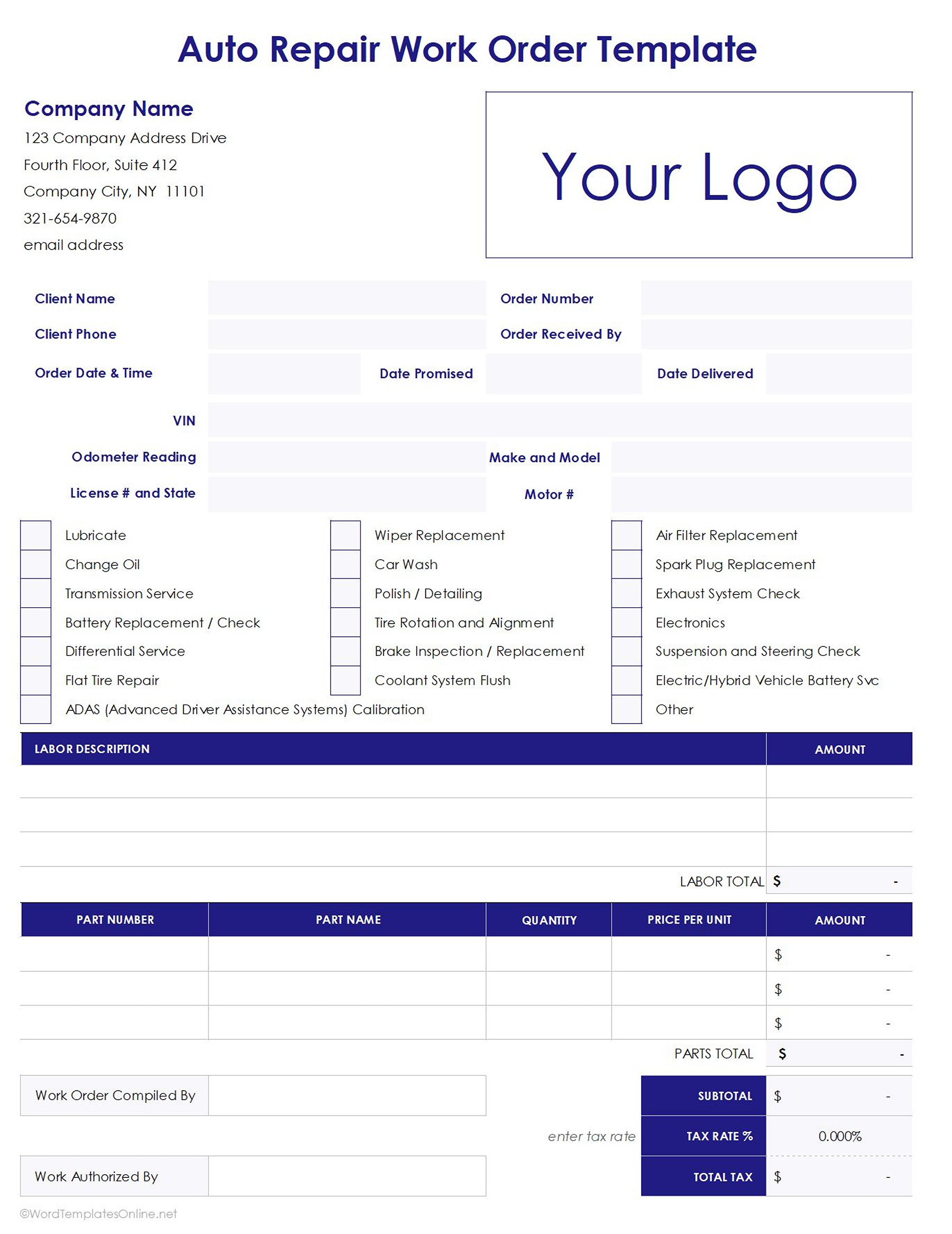 Free Mechanic Work Order Template Word Educational Printable Activities