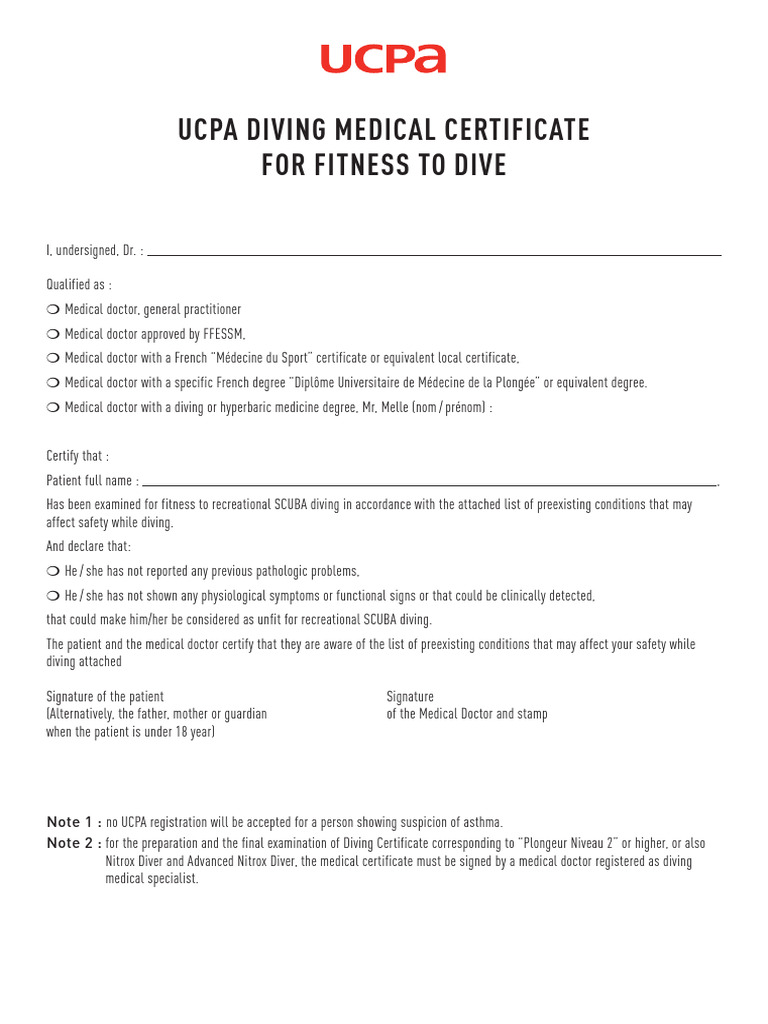 Diving Medical Certificate PDF Underwater Diving Scuba Diving