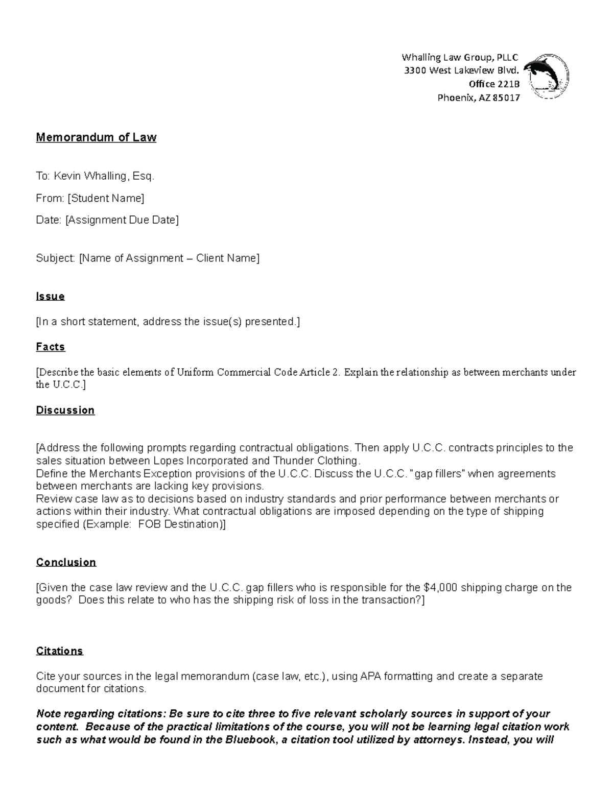 JUS 104 Topic 2 Memorandum of Law Template Whalling Law Group PLLC
