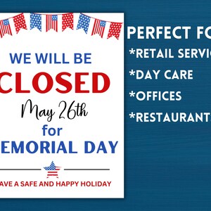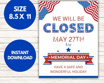 Closed for Memorial Day Printable Sign Instant Download Business
