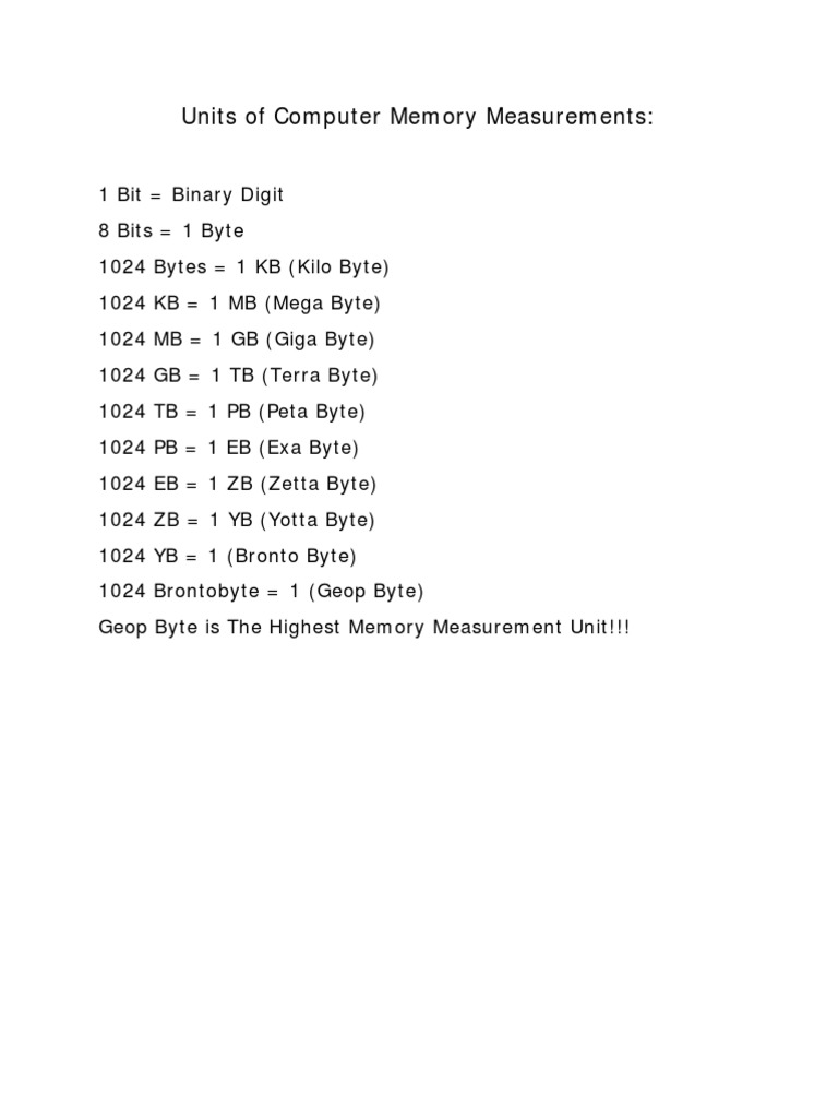 Units of Computer Memory Measurements Chart