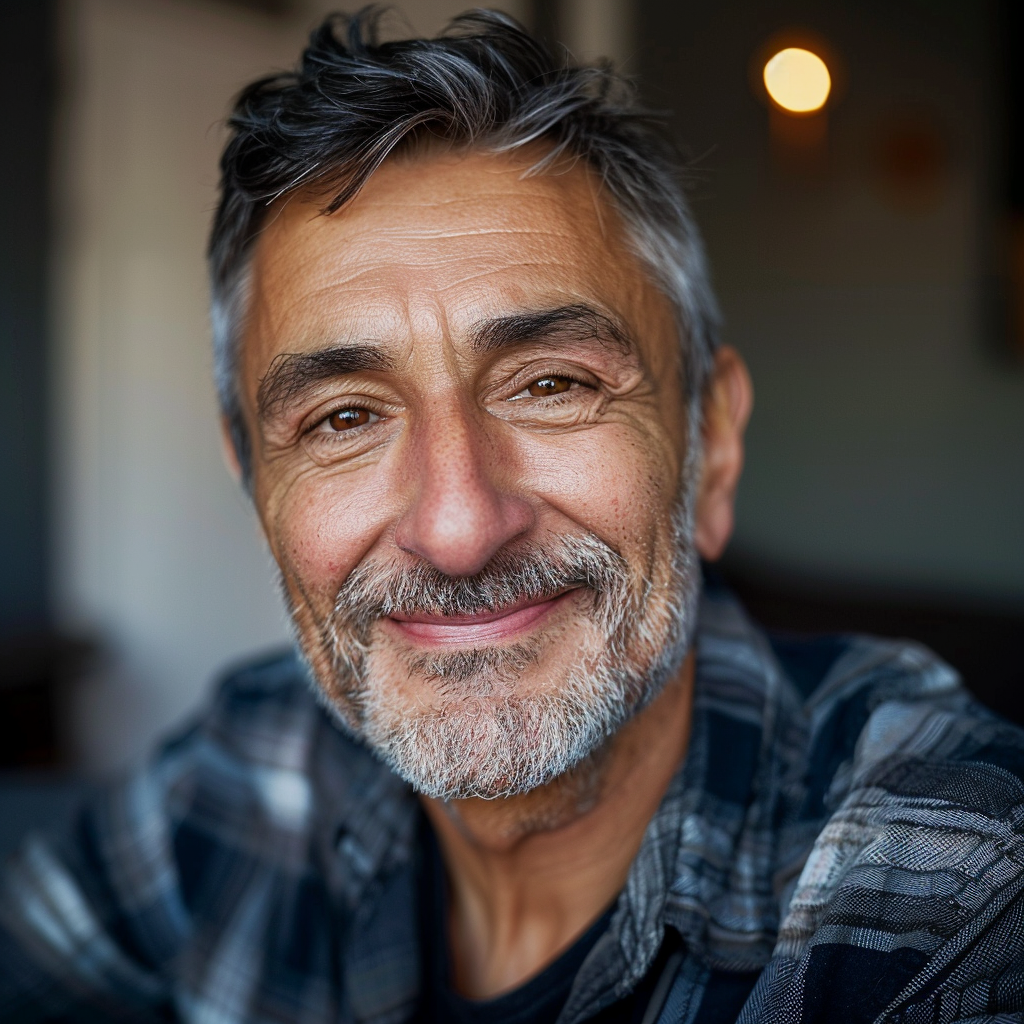 a man with a beard and black shirt in front of a cityscape at night