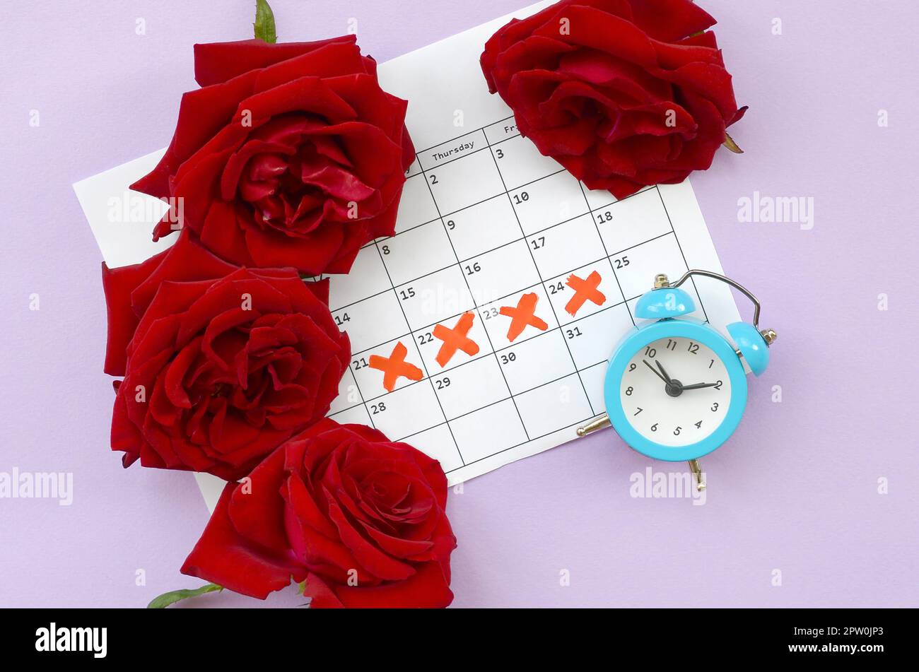 Blue alarm clock and red rose flowers on menstrual period calendar with