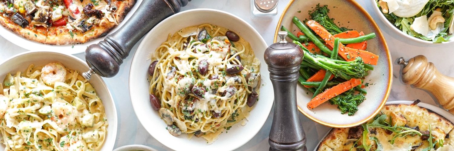 Top view of a rustic pasta menu including classic dishes like spaghetti