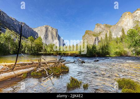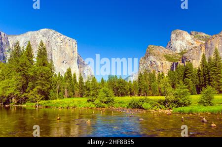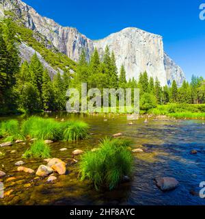 merced river with famous rock el Captain in Yosemite valley on a summer