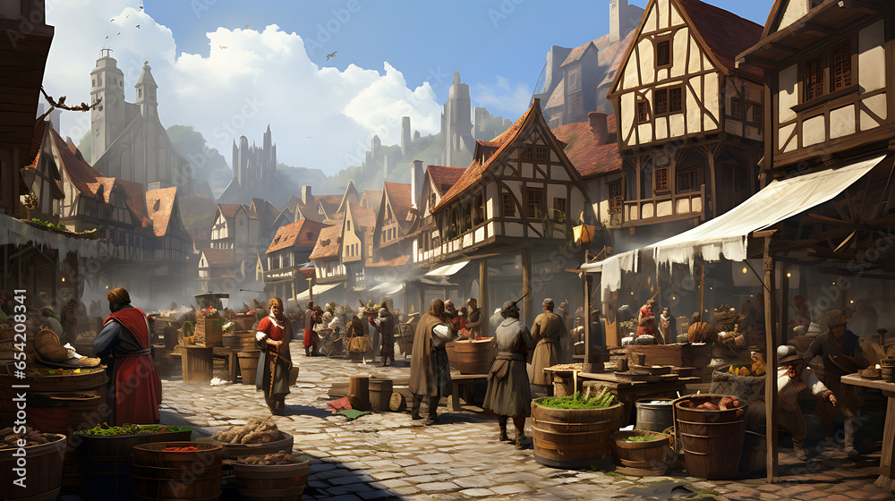 Poster A bustling medieval marketplace with merchants craftsmen and