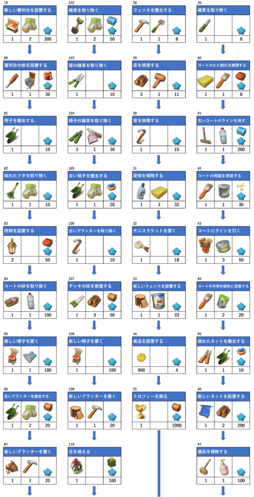 テニスコートのフローチャートとアイテム必要数 マージマンション(Merge Mansion) 攻略サイト