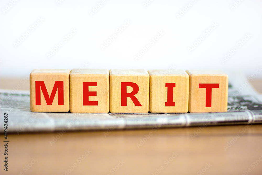 Merit symbol Concept word Merit on wooden cubes Beautiful blue