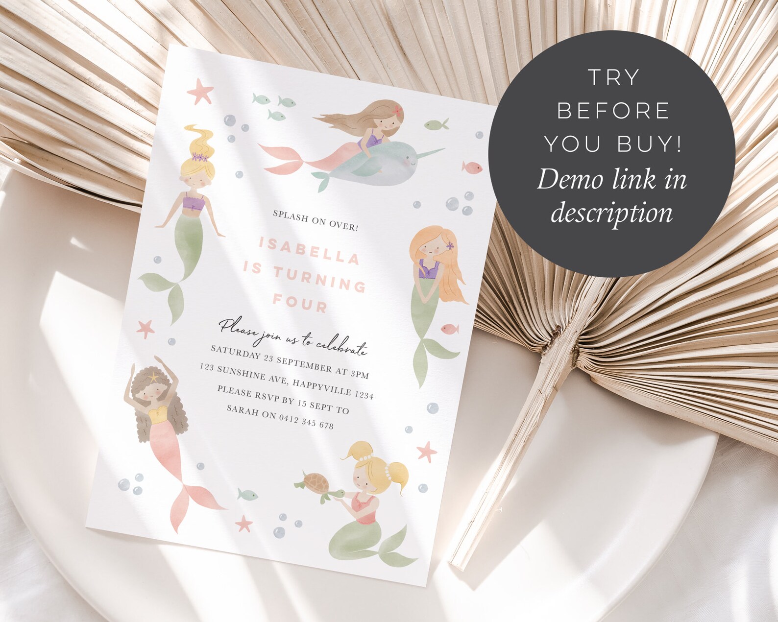 Editable Mermaid Invitation Template Under the Sea Party Invites Girl