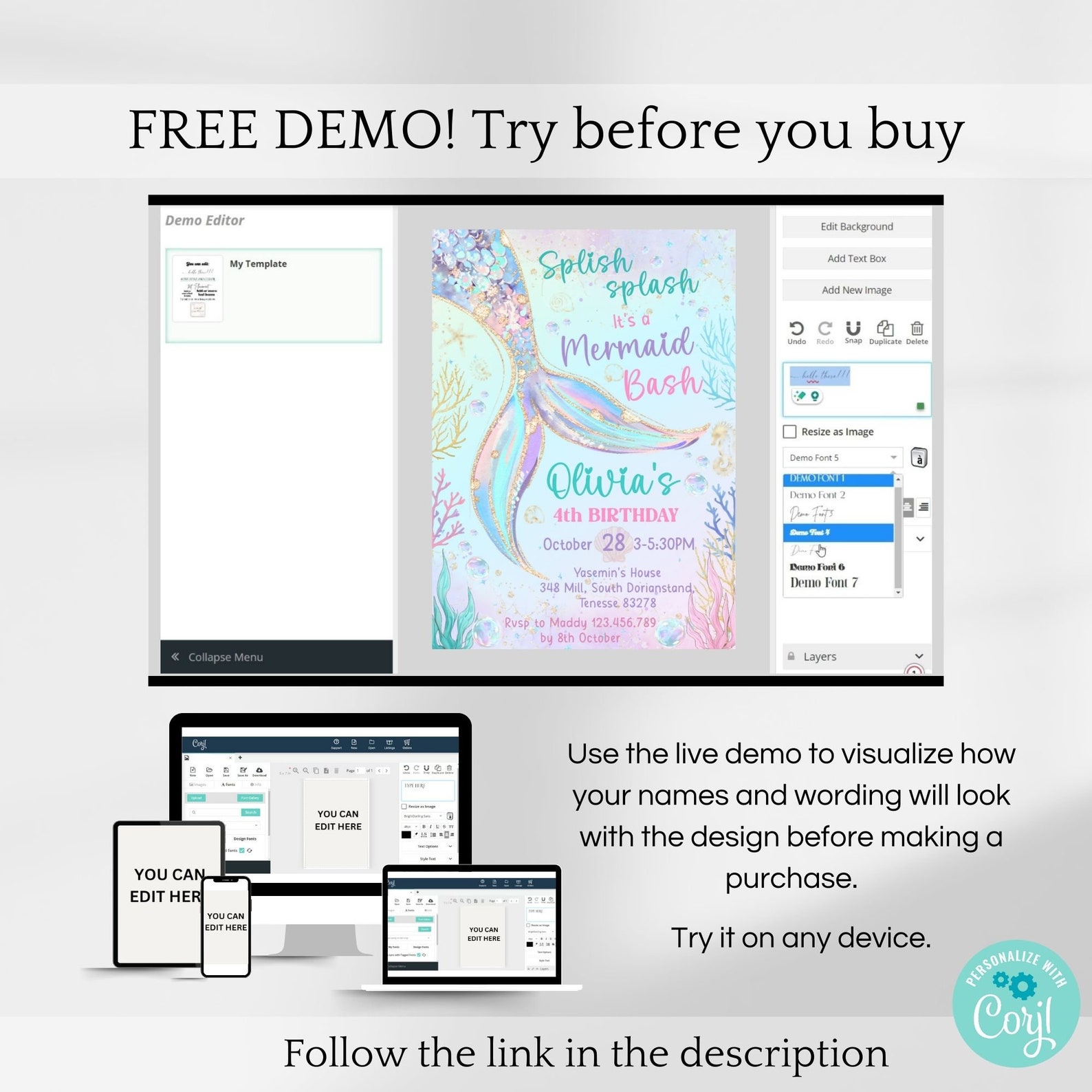 Editable Mermaid Birthday Invitation Mermaid Bash Under the Sea Girl