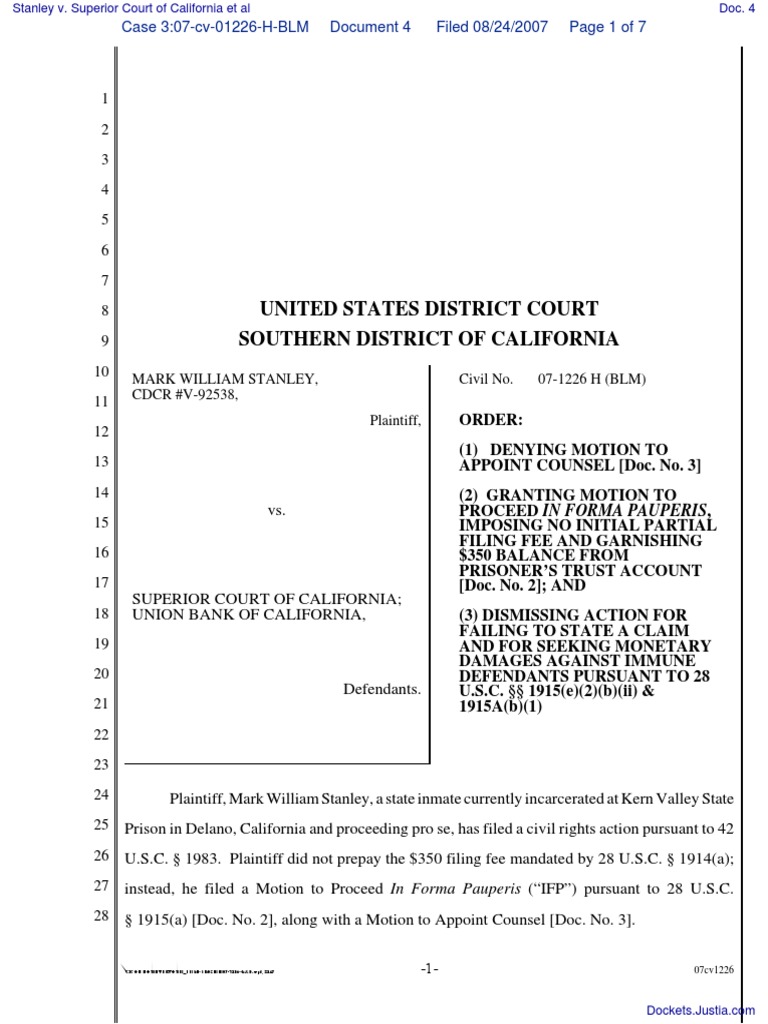 Stanley v Superior Court of California Et Al Document No 4 PDF