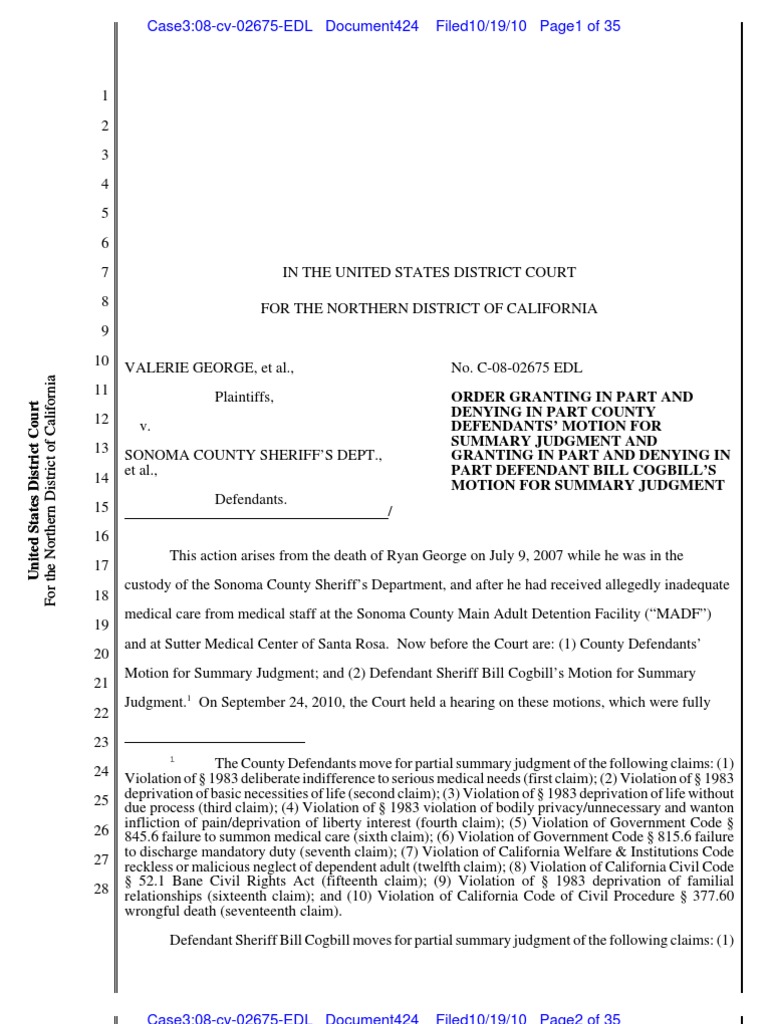 George v Sonoma County Sheriff Dept PDF Summary Judgment Negligence