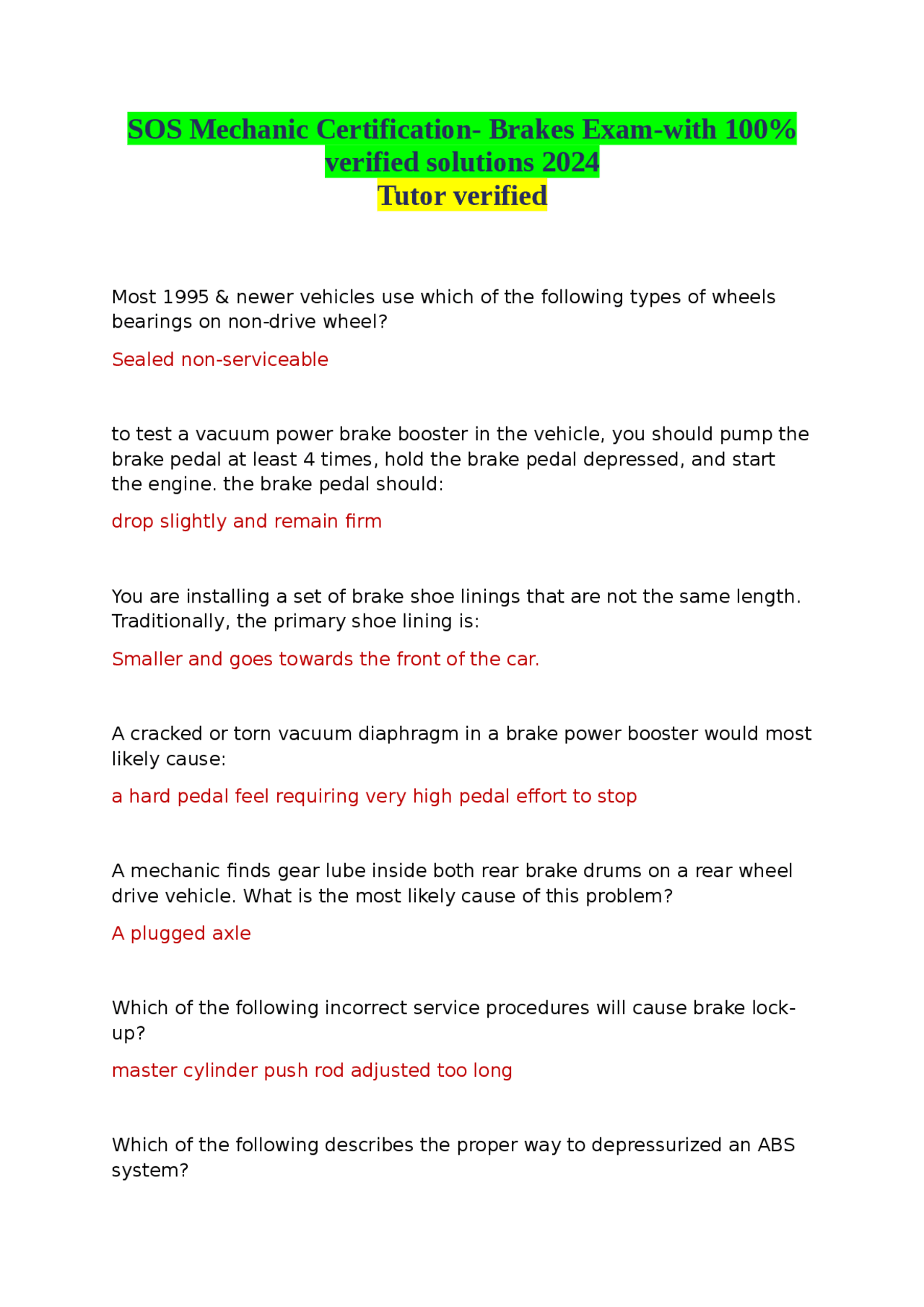 SOS Mechanic Certification Brakes Exam with 100% verified solutions