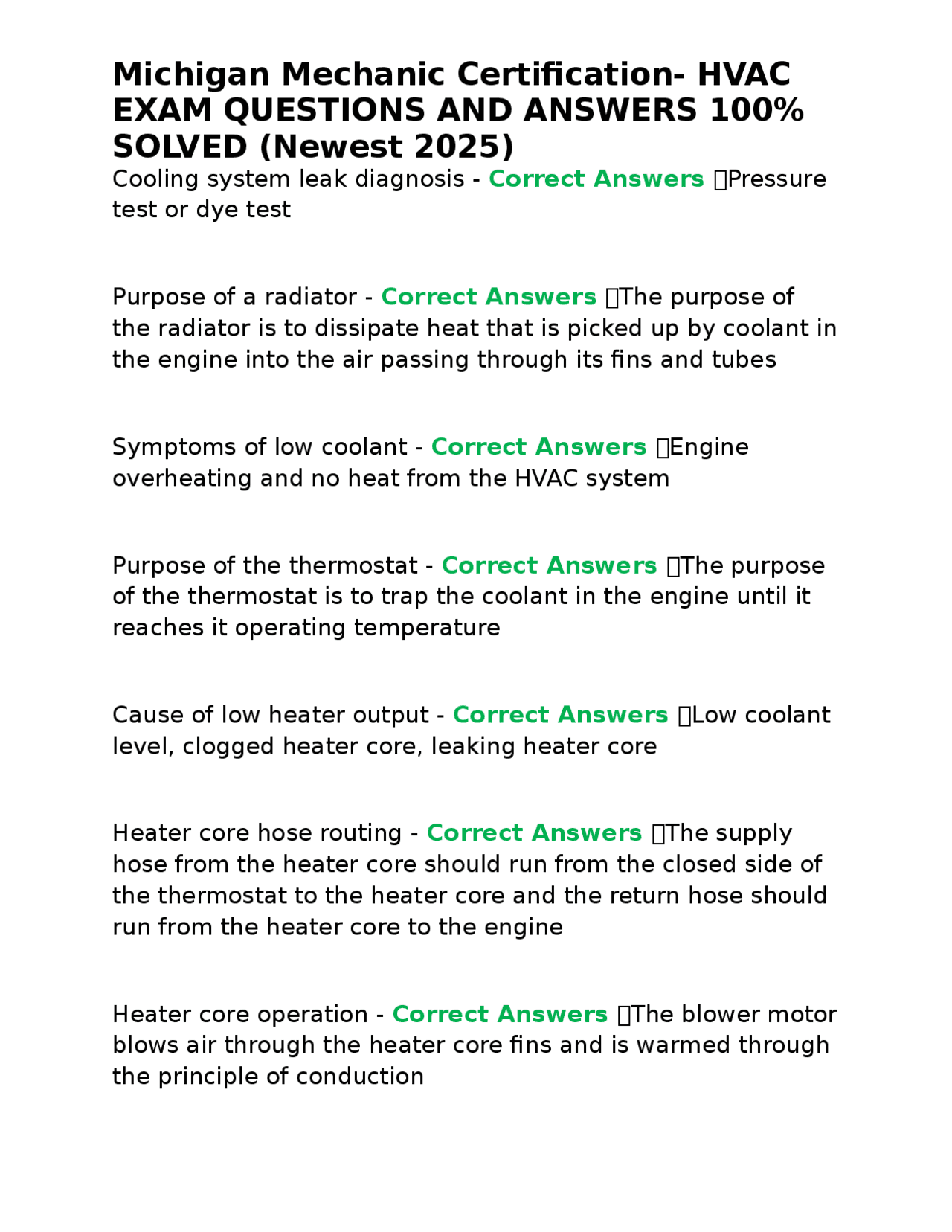 Michigan Mechanic Certification HVAC EXAM QUESTIONS AND ANSWERS 100%