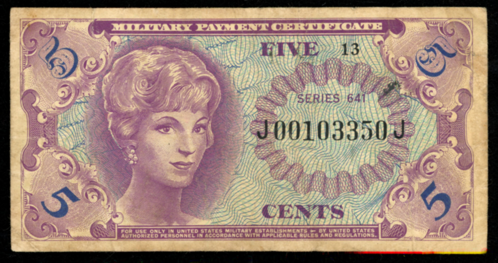 Military payment certificate for five cents issued to an American