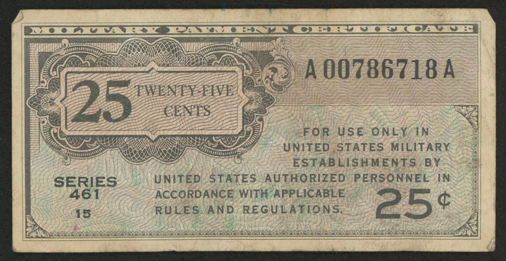 25¢ Twenty Five Cents Series 461 Military Payment Certificate Note (MPC