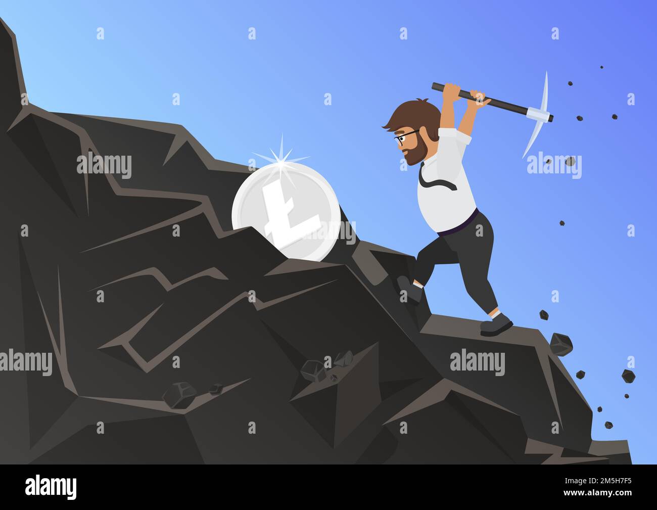 Litecoin mining concept businessman miner holding metaphor pickaxe to