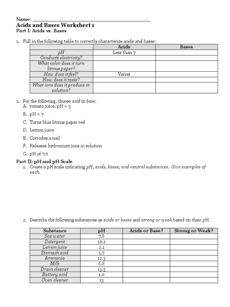 Ph Scale Acids And Bases Worksheet Acid And Base Worksheets