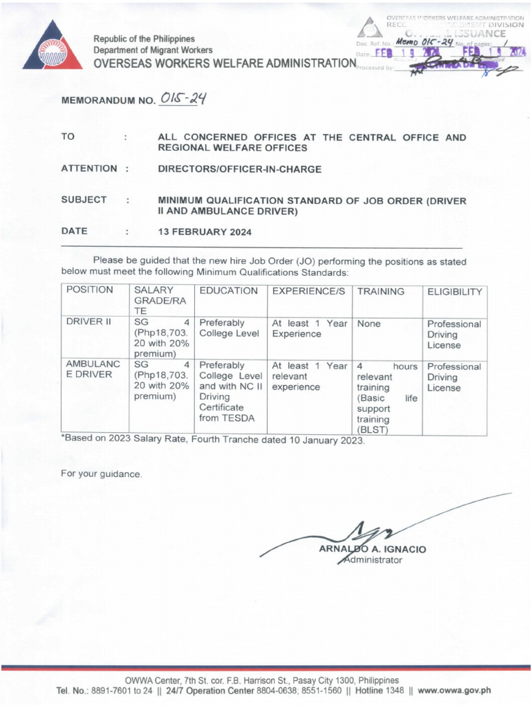 Memo 015 24 Minimum Qualification Standard of Job Order Driver II and