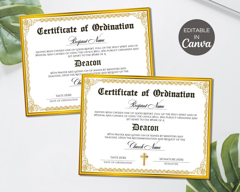 Deacon Ordination Certificate Template Printable Editable Certificate