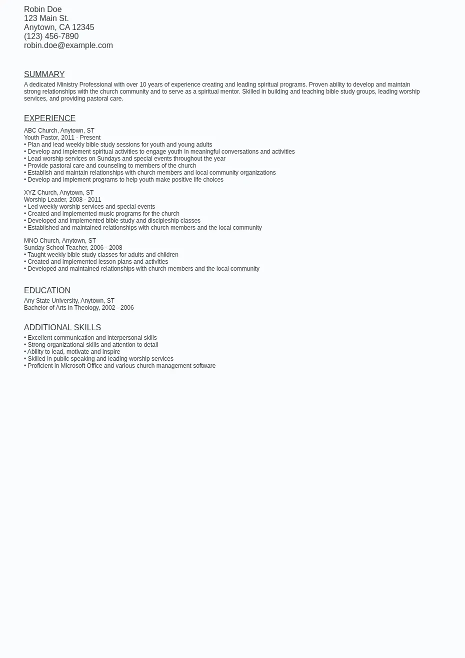 Ministry Resume Sample Template (Free Download) Ziprecruiter