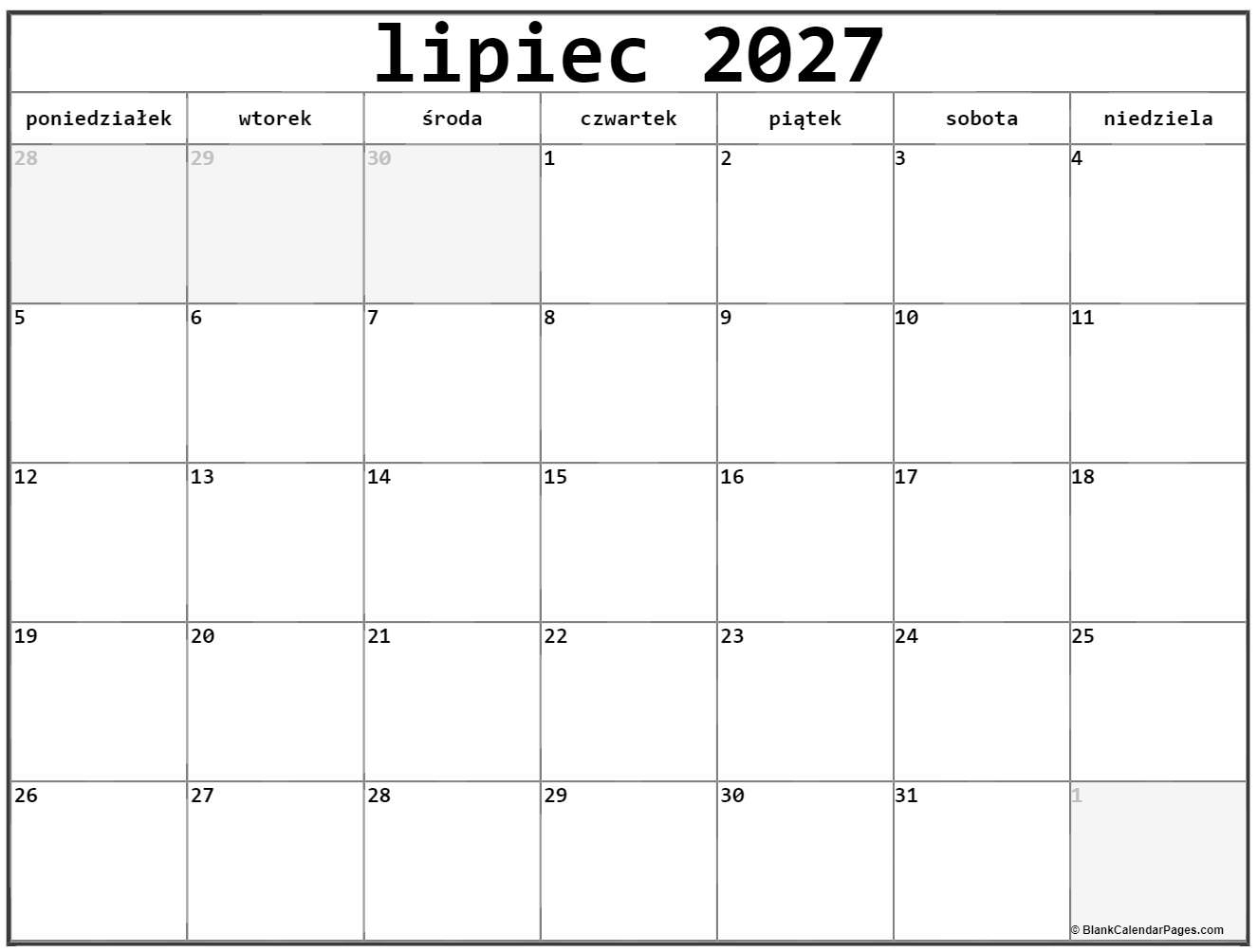 lipiec 2027 bezpłatny kalendarz do druku kalendarz lipiec