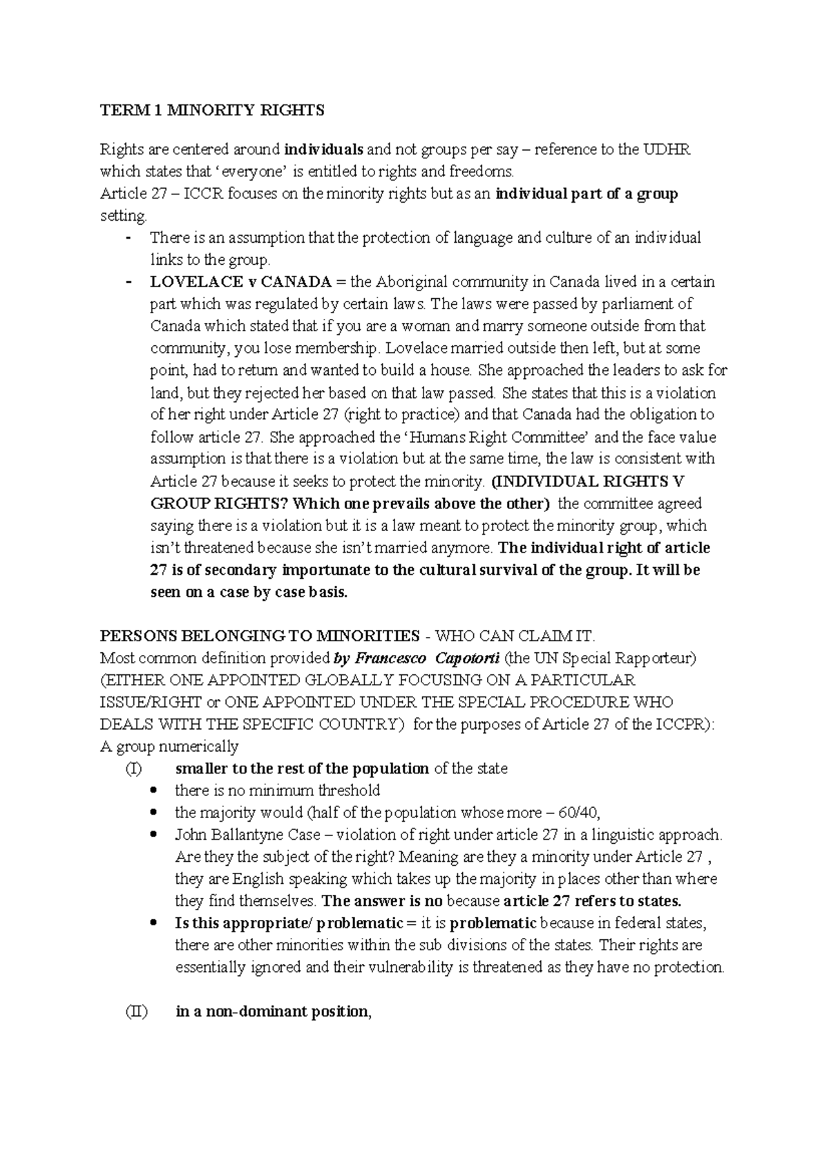 TERM 1 MINORITY RIGHTS: Analyzing Individual vs Group Rights Studocu