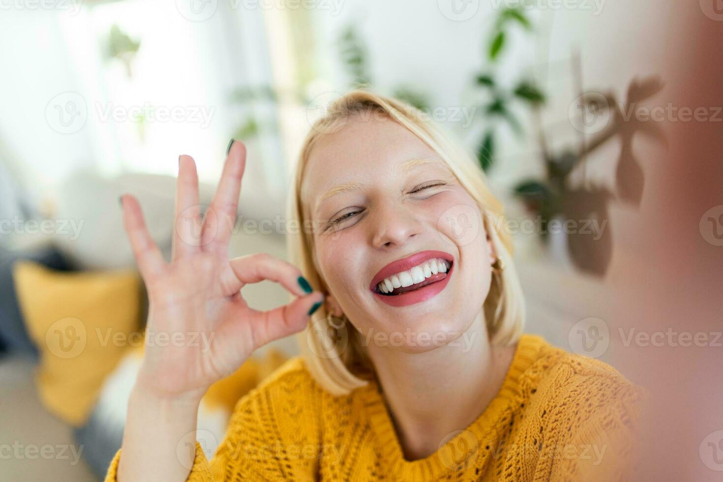 Mischievous young woman takes selfie at home Beautiful blond woman ok