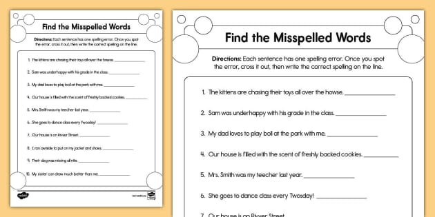 Find The Misspelled Words Worksheet
