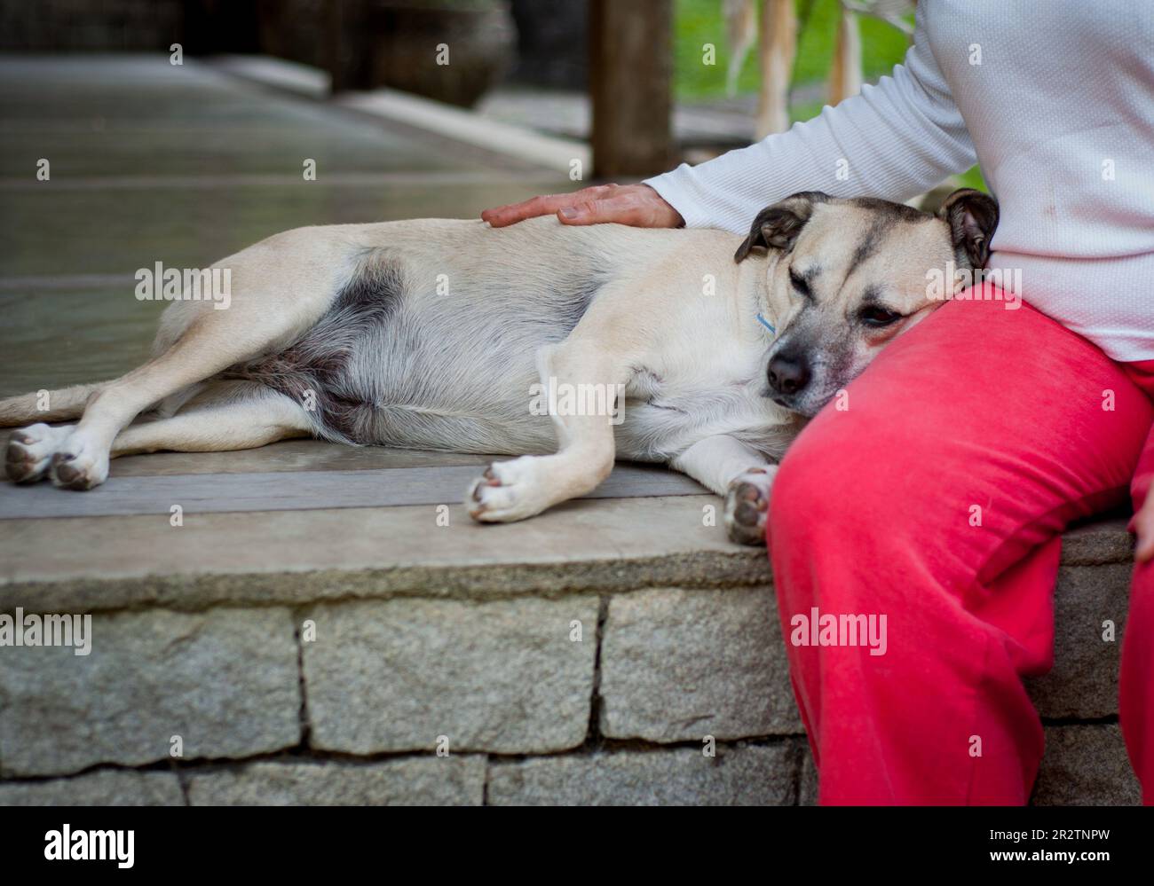 Mixed breed brown dog lying on human lap Stock Photo Alamy