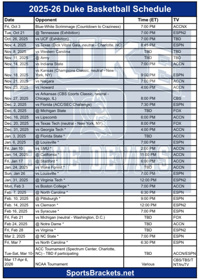 Printable 2025 26 Duke Basketball Schedule PDF format TV Broadcasts