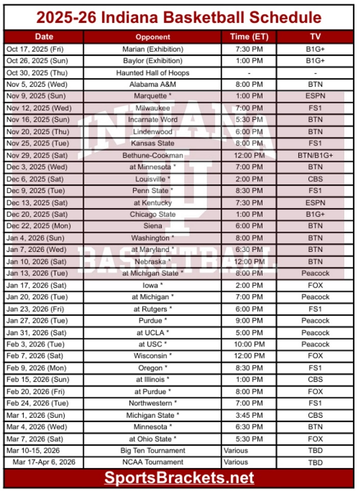 Printable 2025 26 Indiana Basketball Schedule PDF format TV
