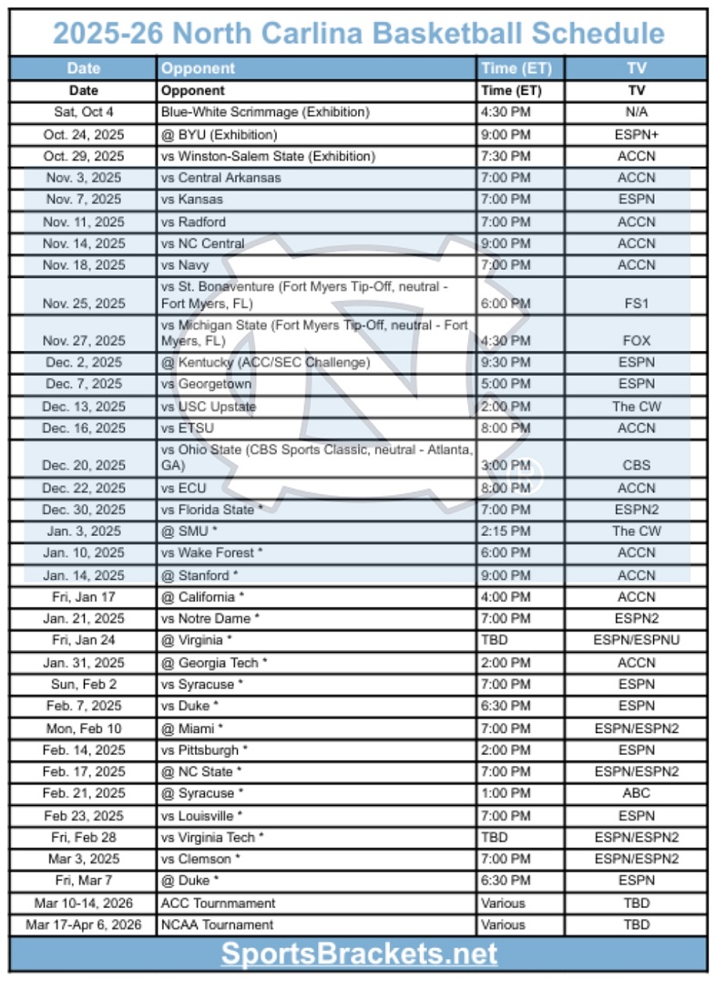 Printable 2025 26 North Carolina Basketball Schedule PDF format TV