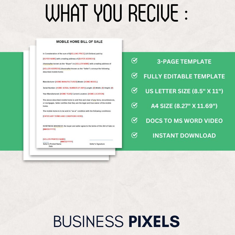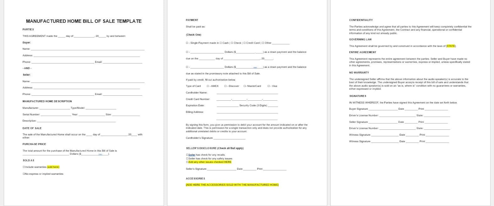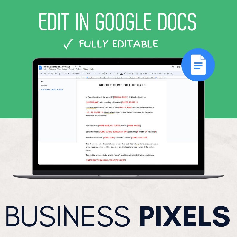 Mobile Home Bill of Sale Microsoft Word Google Docs Template Print Size