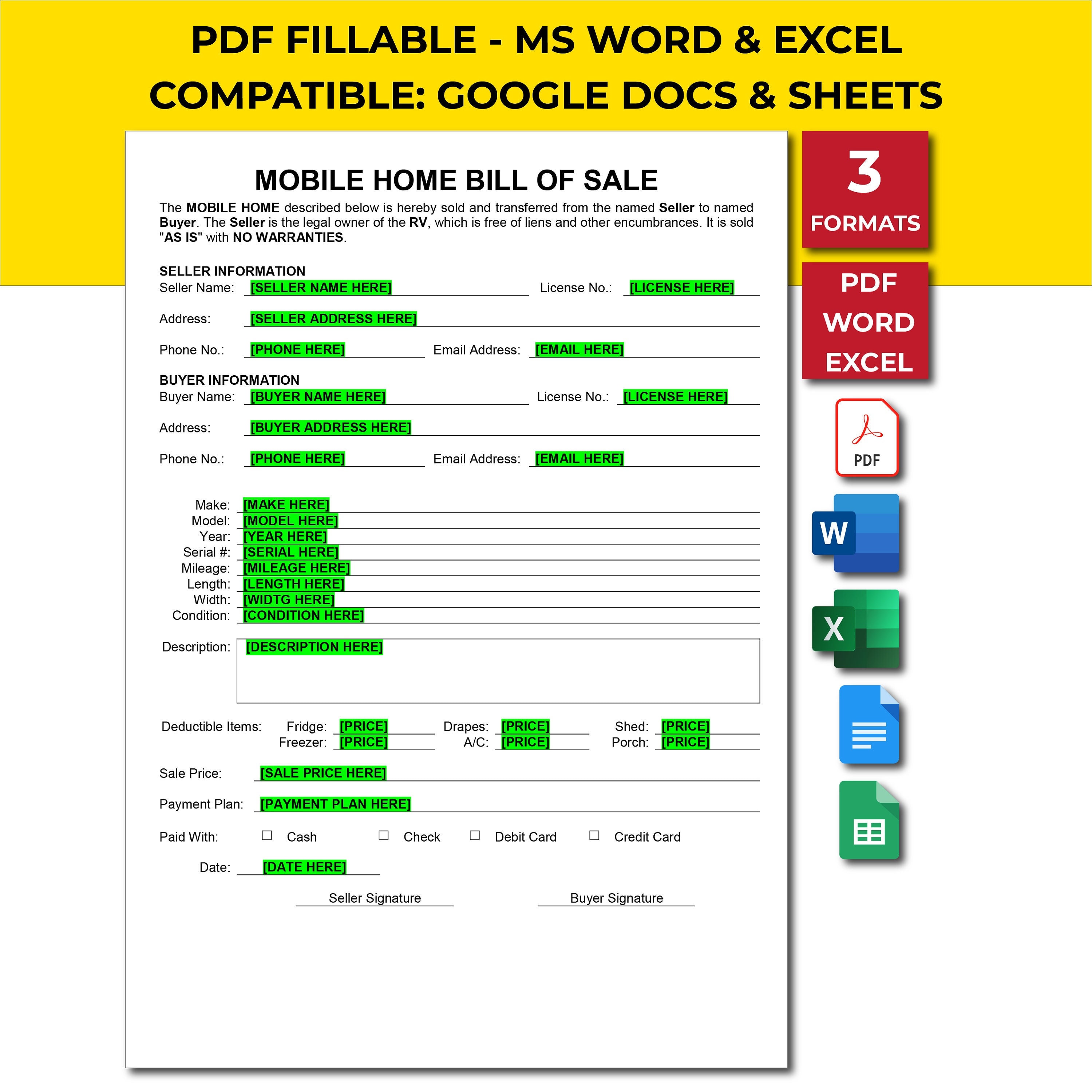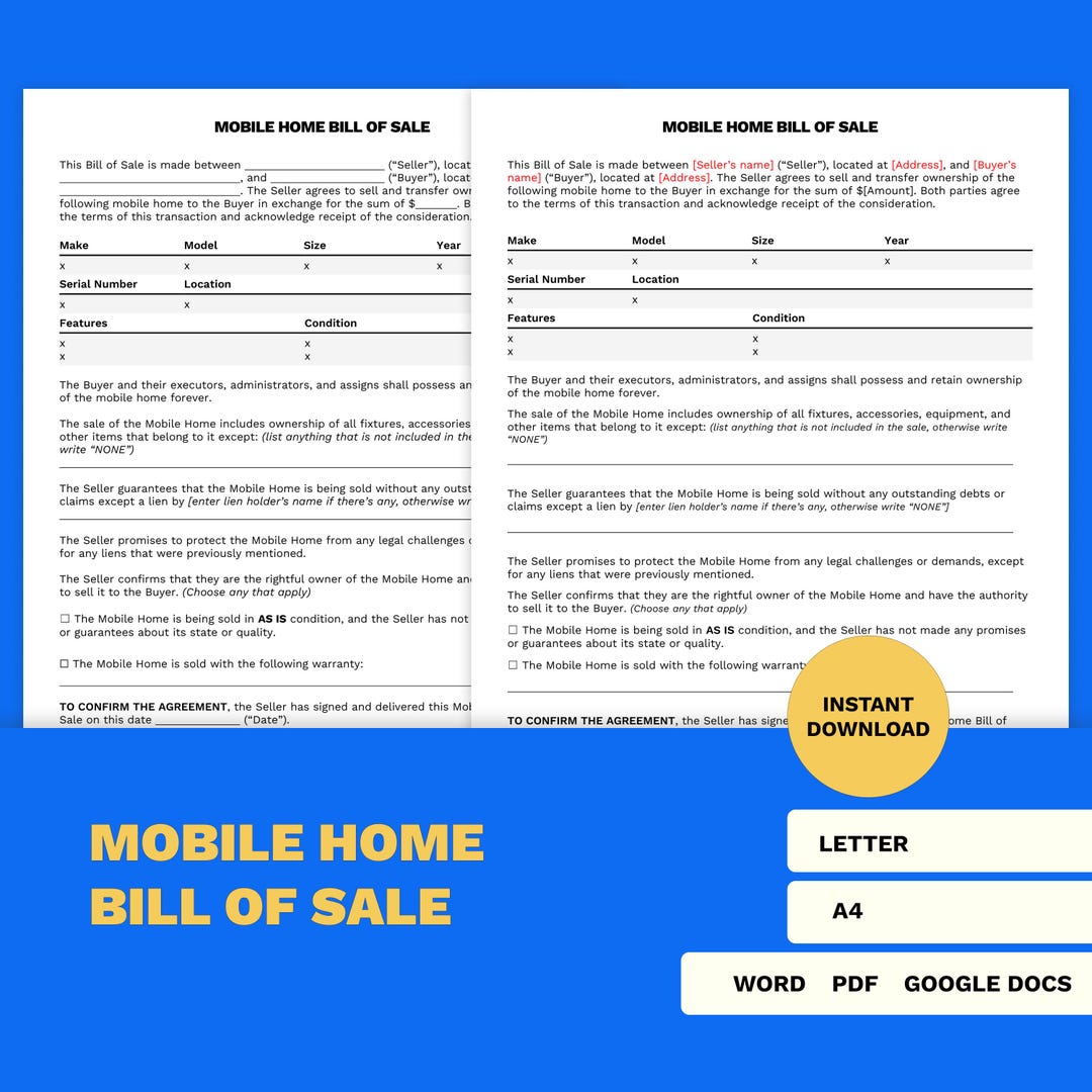 Mobile Home Bill of Sale Microsoft Word PDF Google Docs Template Print