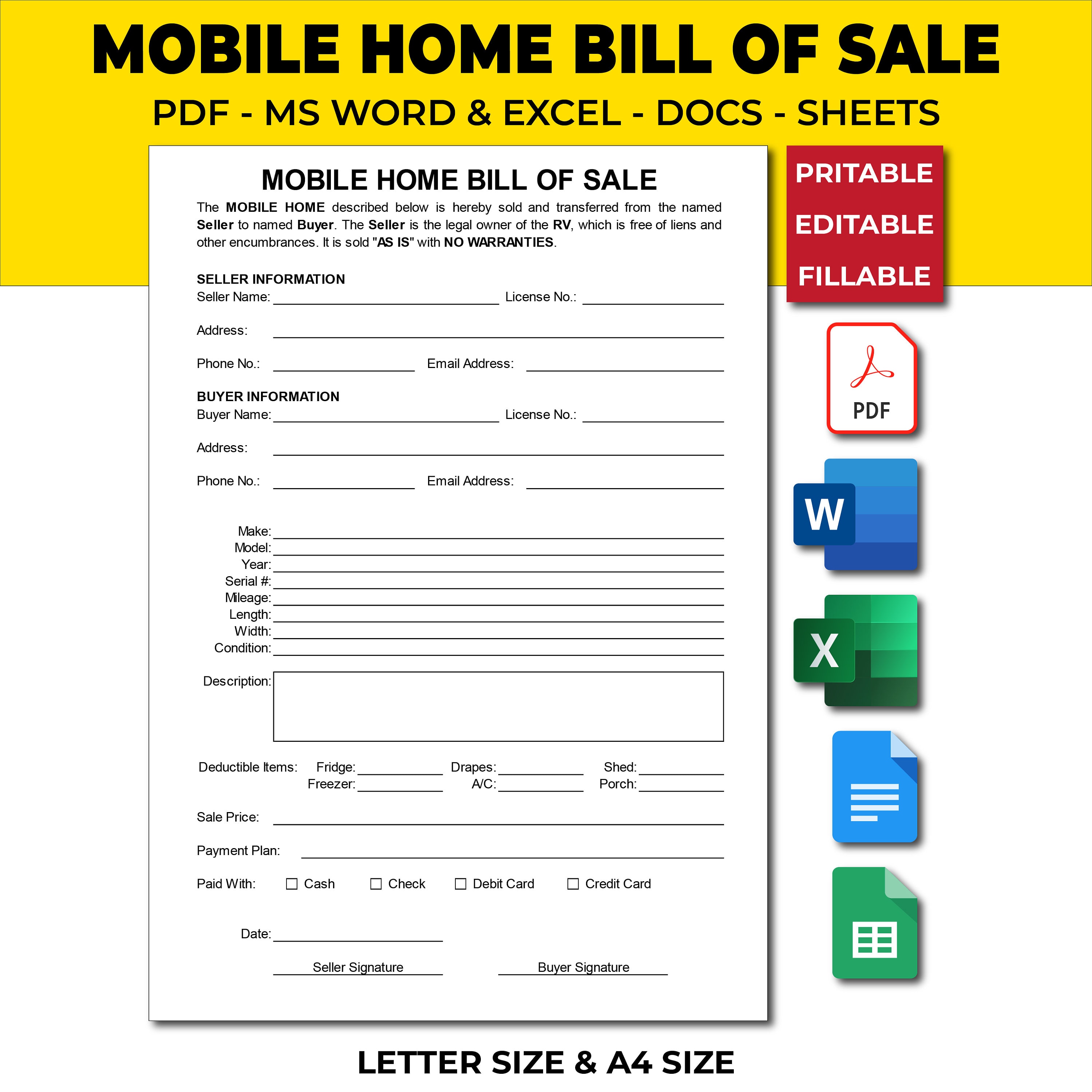Editable Mobile Home Bill of Sale Printable in Microsoft Word Google