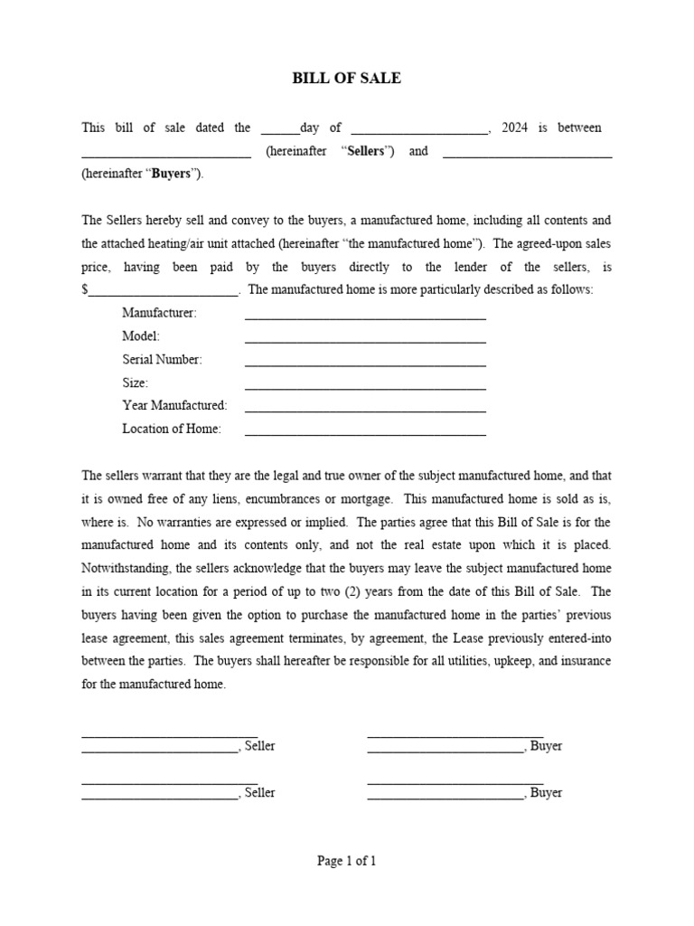 Mobile Home Bill of Sale Template Legal Document for Buying Selling