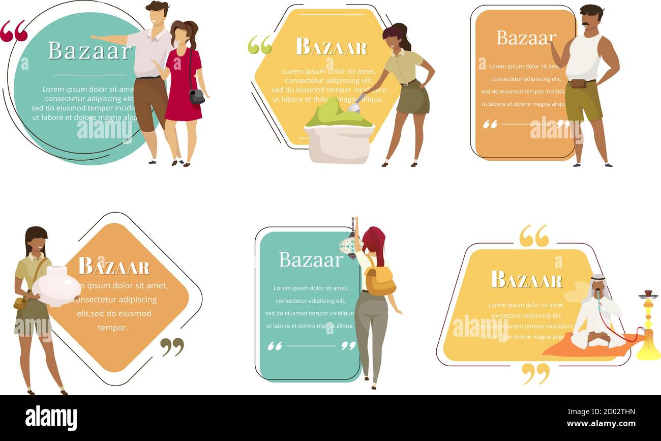 Bazaar sellers flat color vector character quotes set Oriental fair