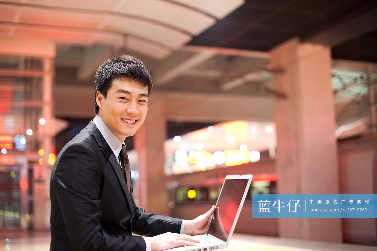 商务人士在火车站使用笔记本电脑 蓝牛仔影像 中国原创广告影像素材