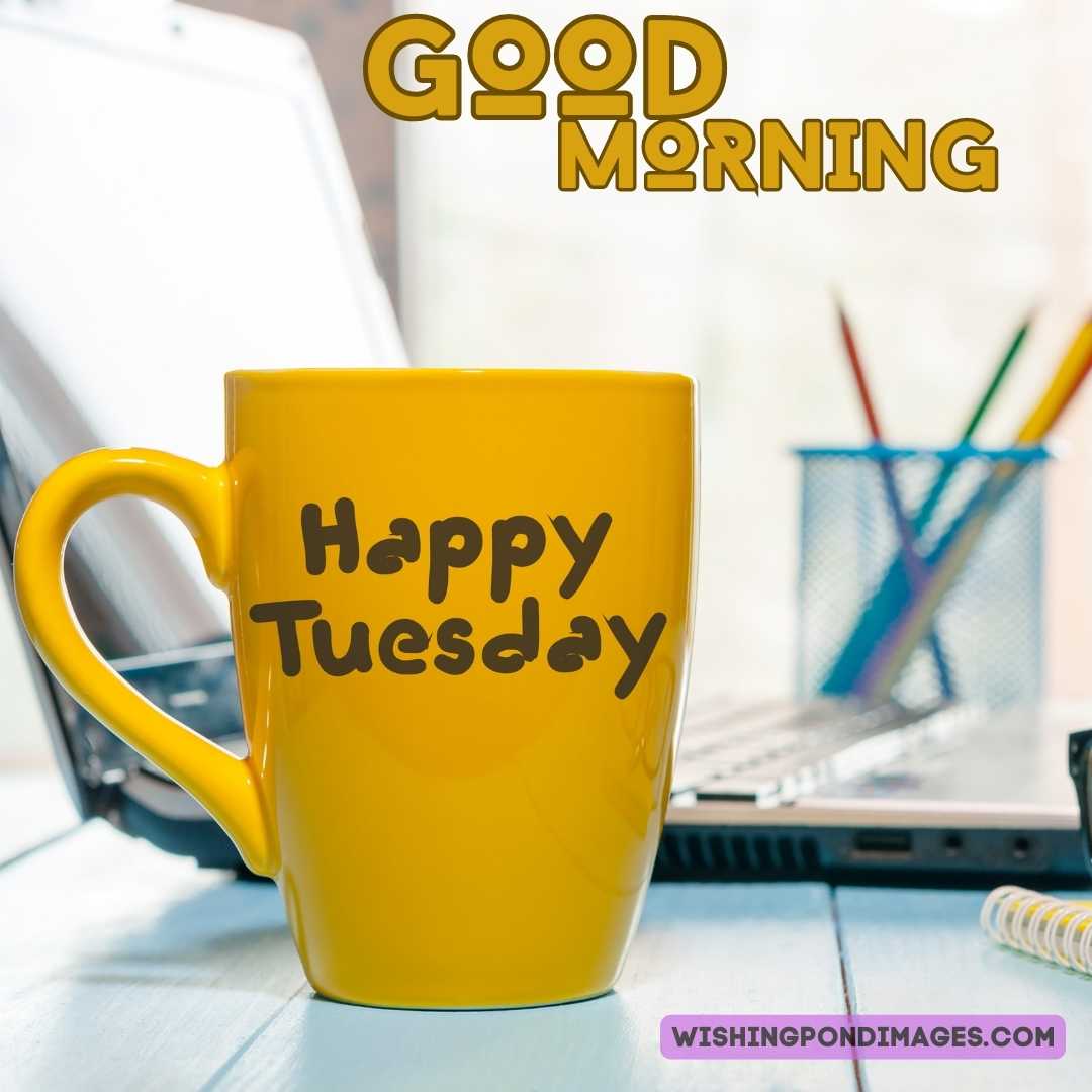 Yellow Mug with Happy Tuesday Text on Desk Perfect for Motivational