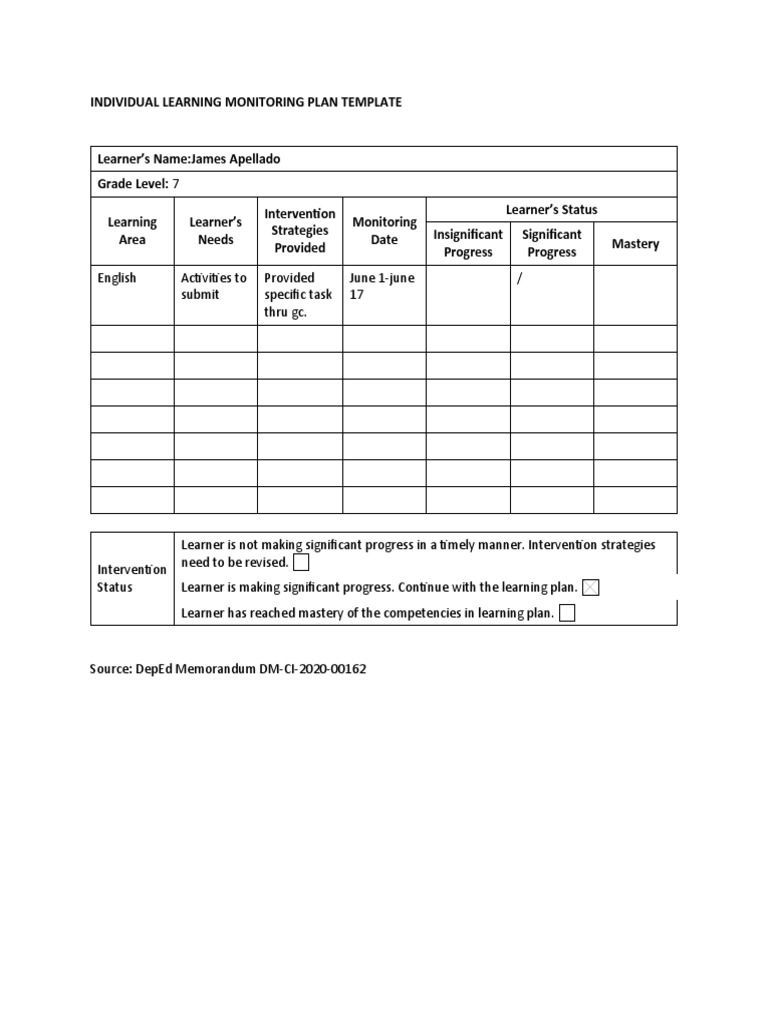 INDIVIDUAL LEARNING MONITORING PLAN SAMPLE TEMPLATE