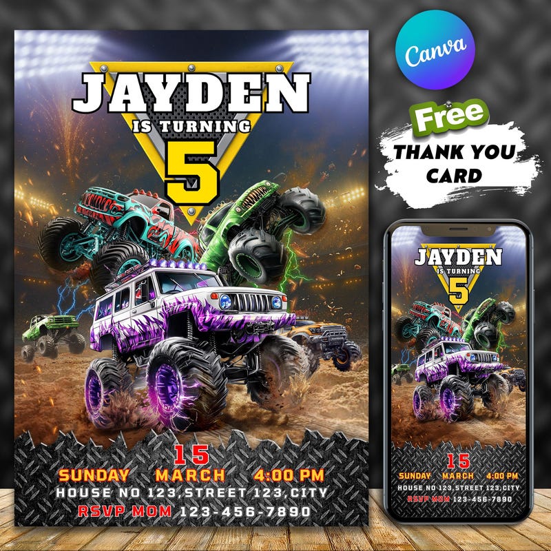 Bearbeitbare Monster Truck Geburtstagseinladung bearbeitbare Vorlage