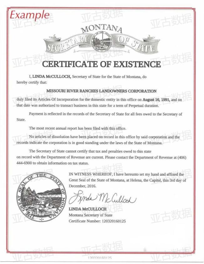 美国蒙大拿州(Montana)公司Good Standing证书 存续证明 亚古数据