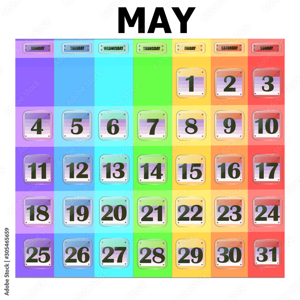 Colorful calendar for May 2020 in english Set of buttons with calendar