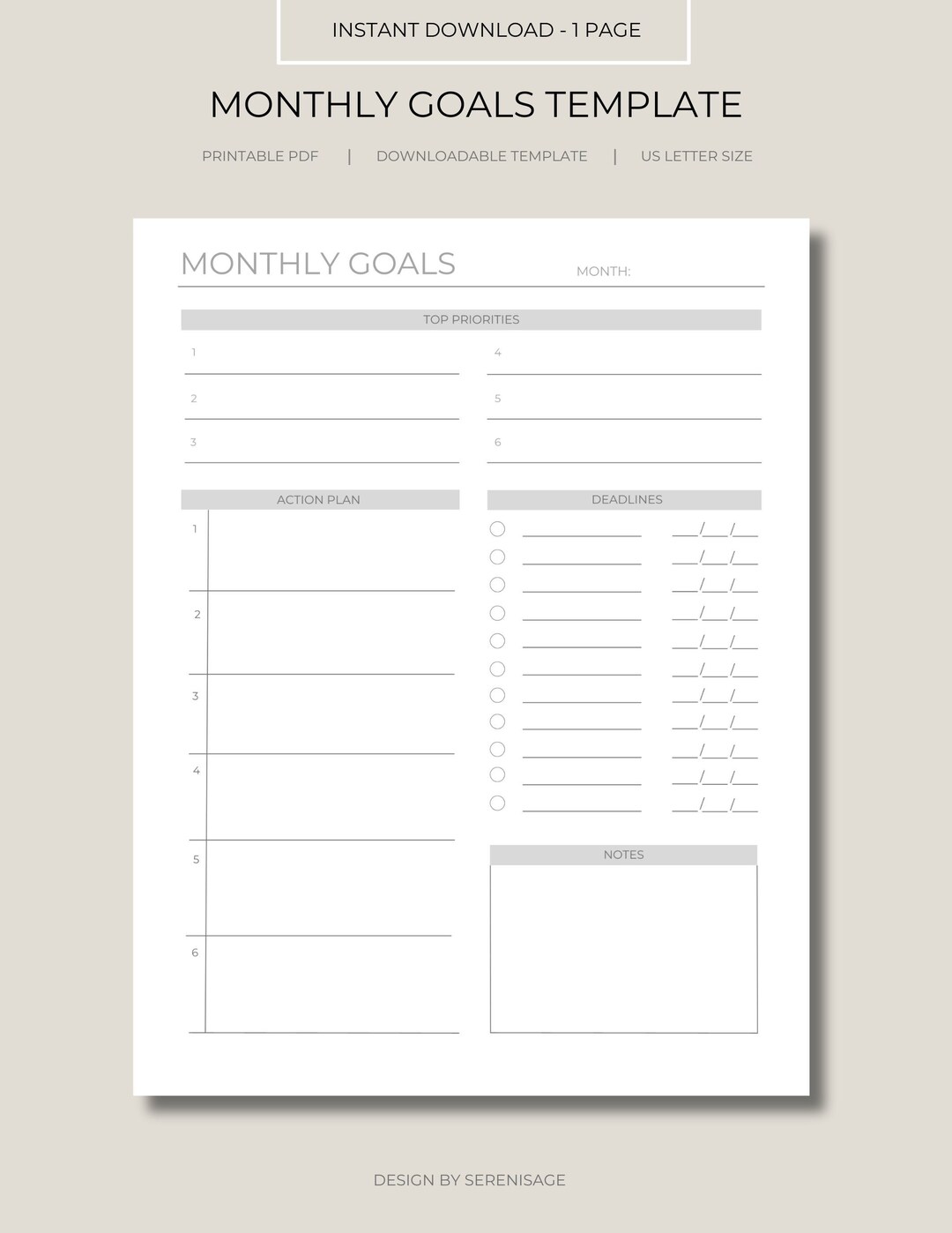 Downloadable Printable Monthly Goals Template Etsy Goals template
