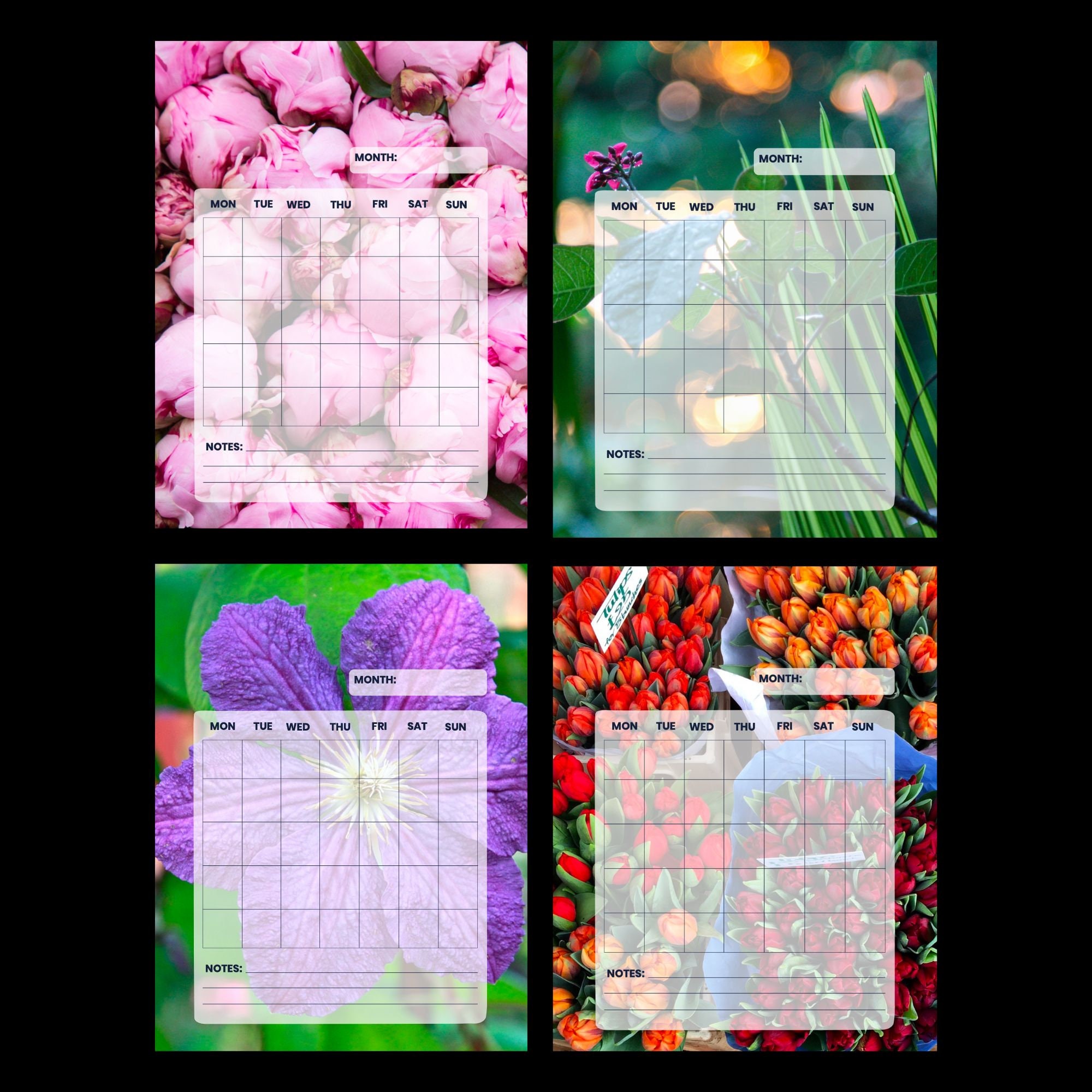 Colorful Printable Monthly Calendar Pages Undated Vertical and Horizontal