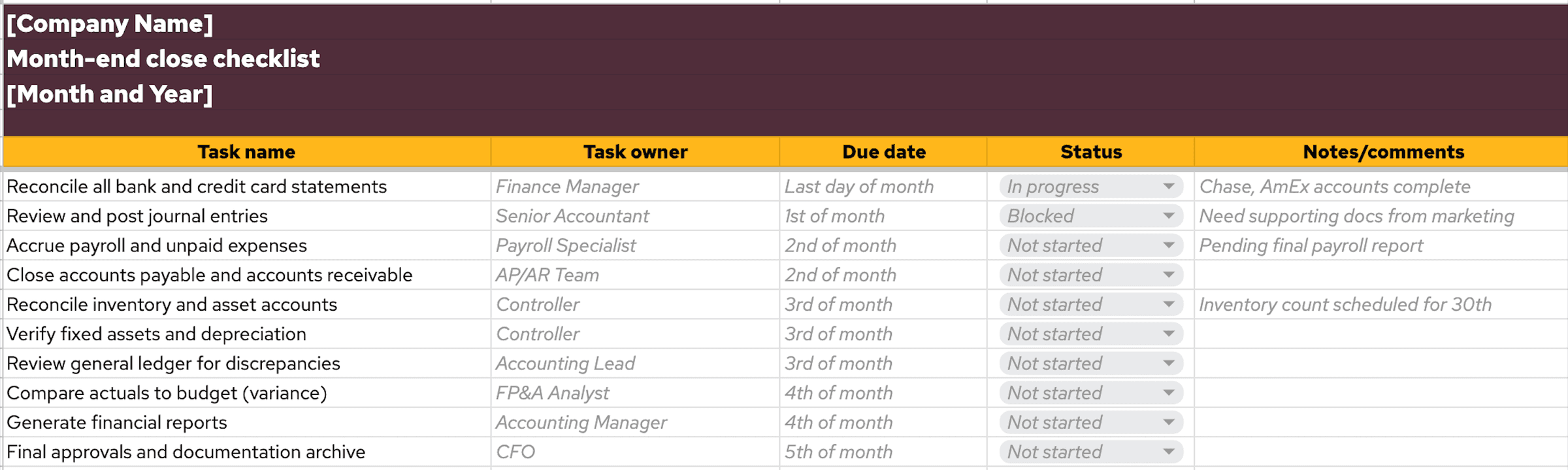 Month End Close Checklist Excel Template